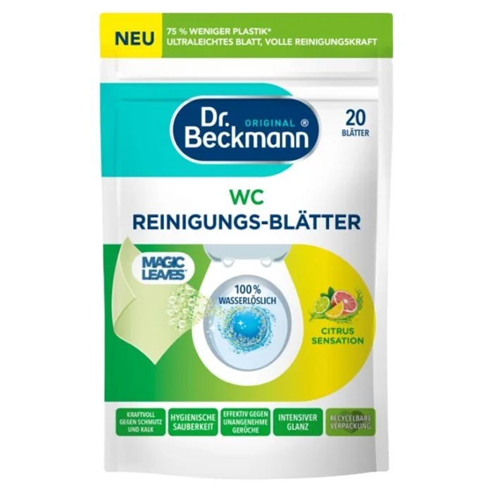 Vees lahustuvad tualetipuhastuslehed värske tsitruselõhnaga. Dr. Beckmann Magic Leaves WC-puhastuslehed on uus ja mugav viis hoida tualettruum puhtana ja värskena. Need 100% vees lahustuvad lehed vabastavad iga loputuse ajal puhastusained ja meeldiva citrus-aroomi, mis aitab neutraliseerida ebameeldivaid lõhnu ning vähendada plekke, uriinijääke ja katlakivi tekkimist tualetikausil.